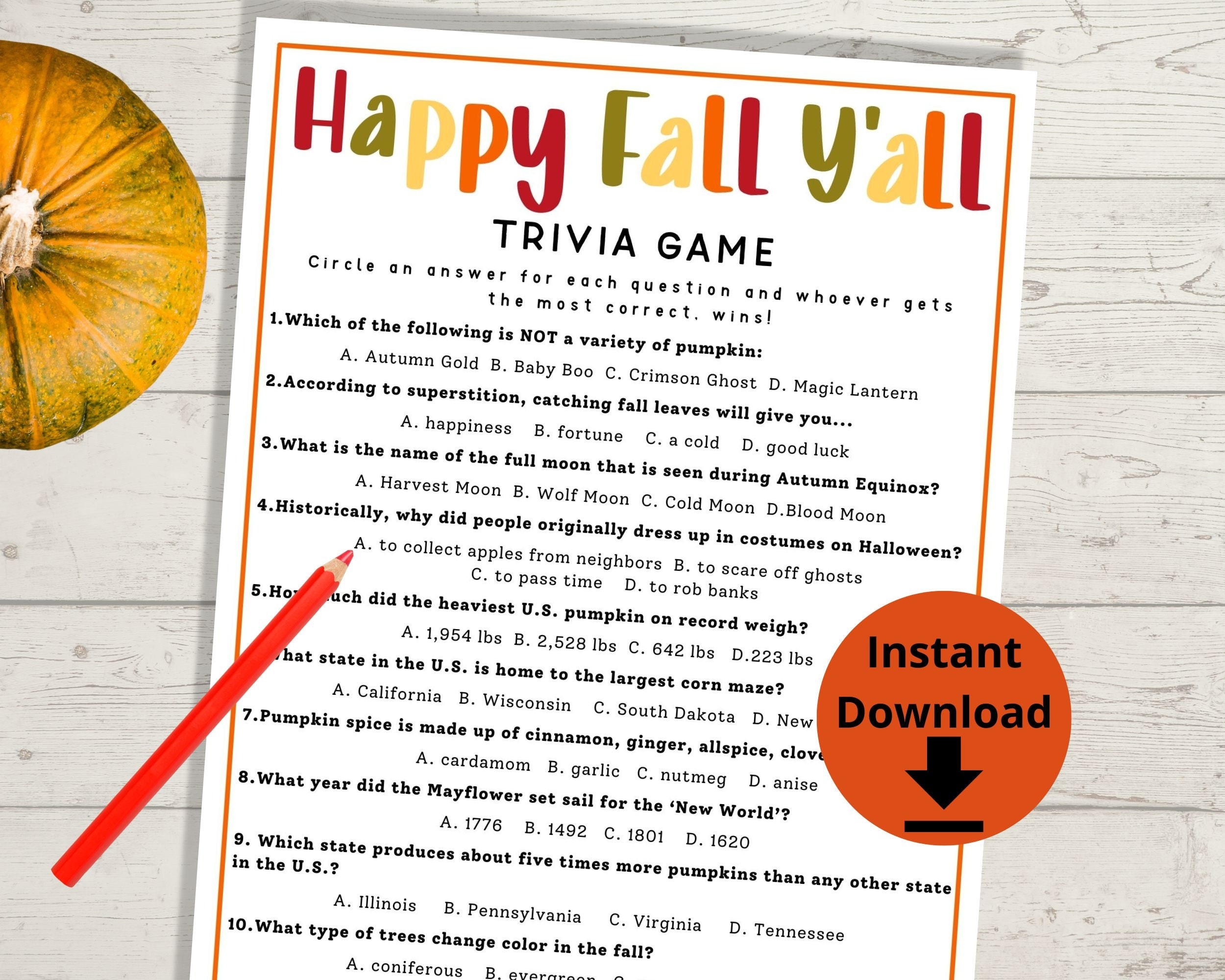Fall Trivia Game Printable Autumn Quiz For Adults Teens And Kids Fall Activity For The Classroom Or Homeschooling Fall Office Party Game Etsy