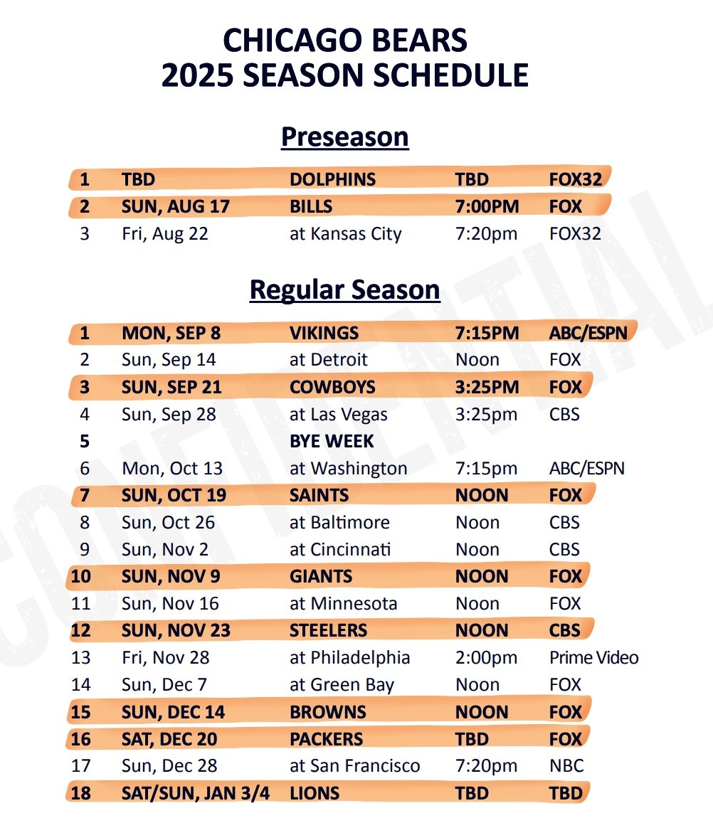 Larry Hawley On X Now Official Here s The Chicago Bears 2025 Season Schedule 3 Prime Time Games Black Friday Game One Saturday Game No Thursday Night Games Bears Open