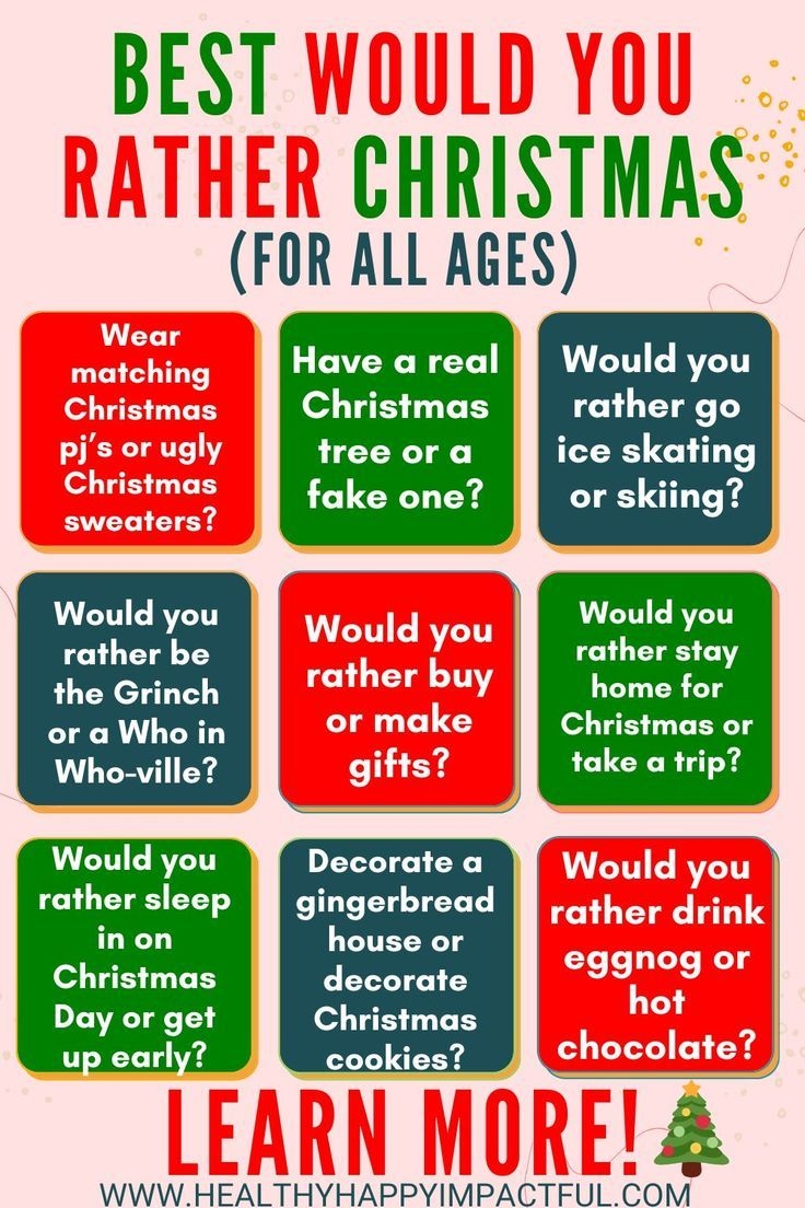 With the holiday season just around the corner, it’s time to start planning some fun activities for the whole family to enjoy. One great way to get everyone involved is by playing a game of “Would You Rather” with a Christmas twist!