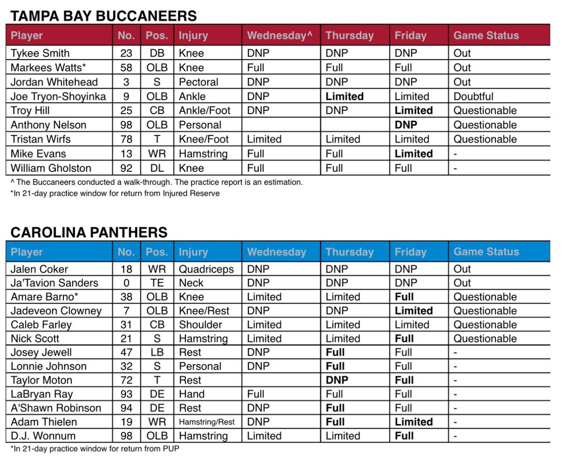 Greg Auman On X Here s The Final Injury Report For Bucs And Panthers Joe Tryon Shoyinka Is Listed As Doubtful Panthers Down Two Rookies On Offense Https t co nkablpm0ZF X