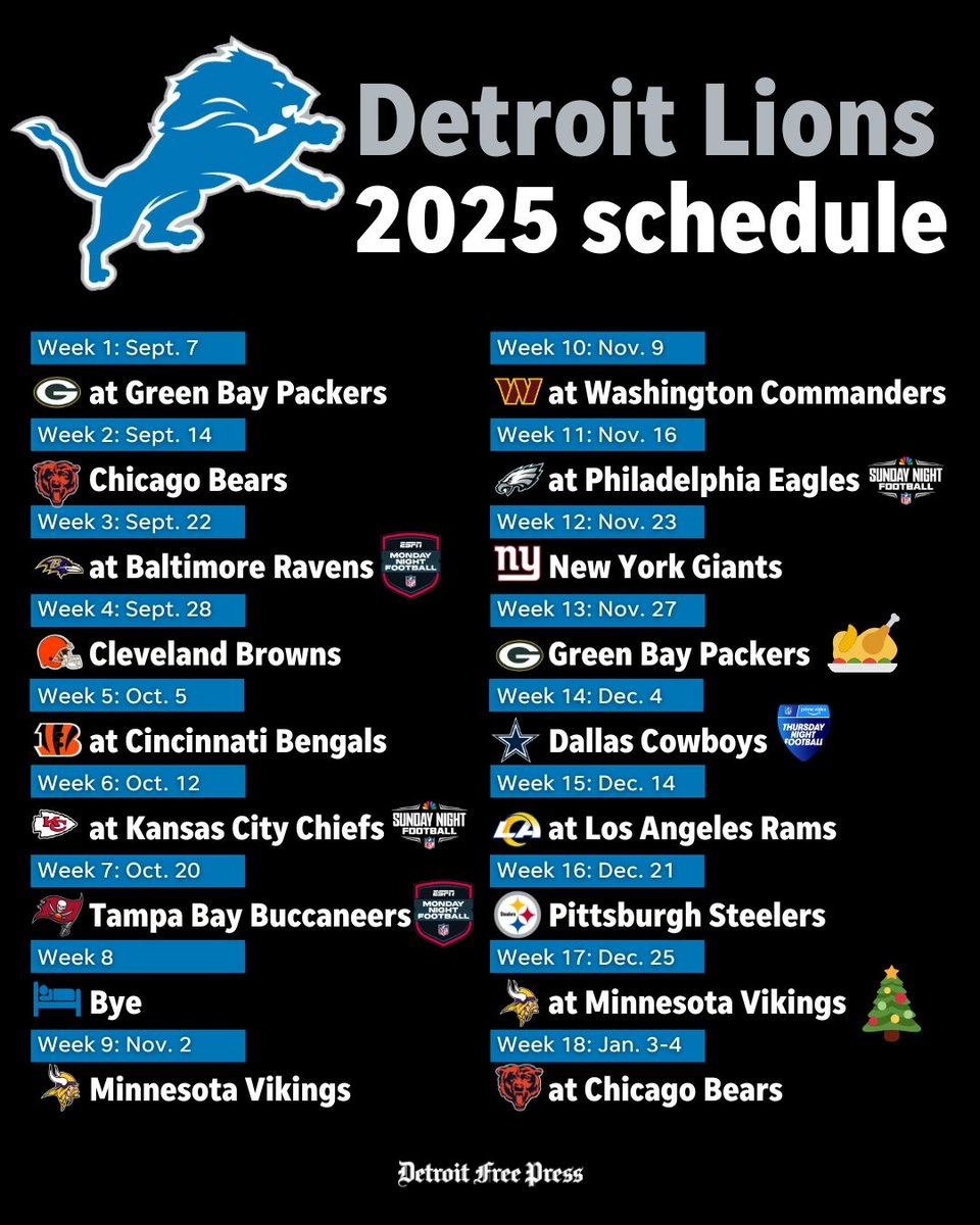 Detroit Free Press On X It s Here The Detroit Lions 2025 Regular Season Schedule Is Now Official What s Your Record Prediction For This Season Lions OnePride Https t co WkK08dQv6V X