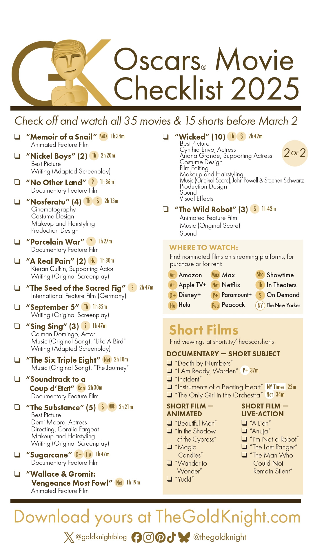 Oscars 2025 Download Our Printable Movie Checklist The Gold Knight Latest Academy Awards News And Insight