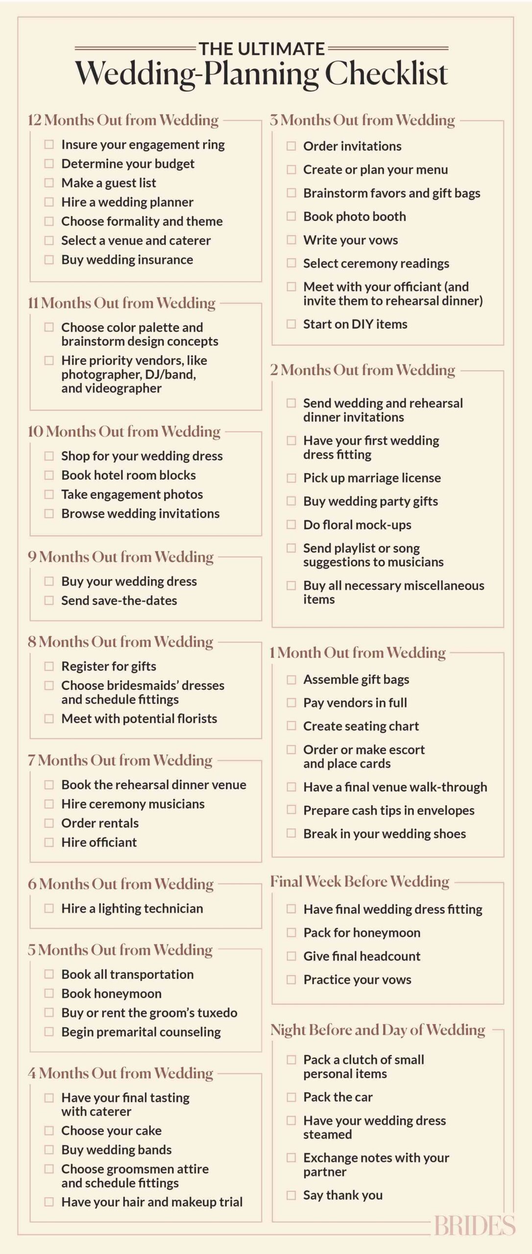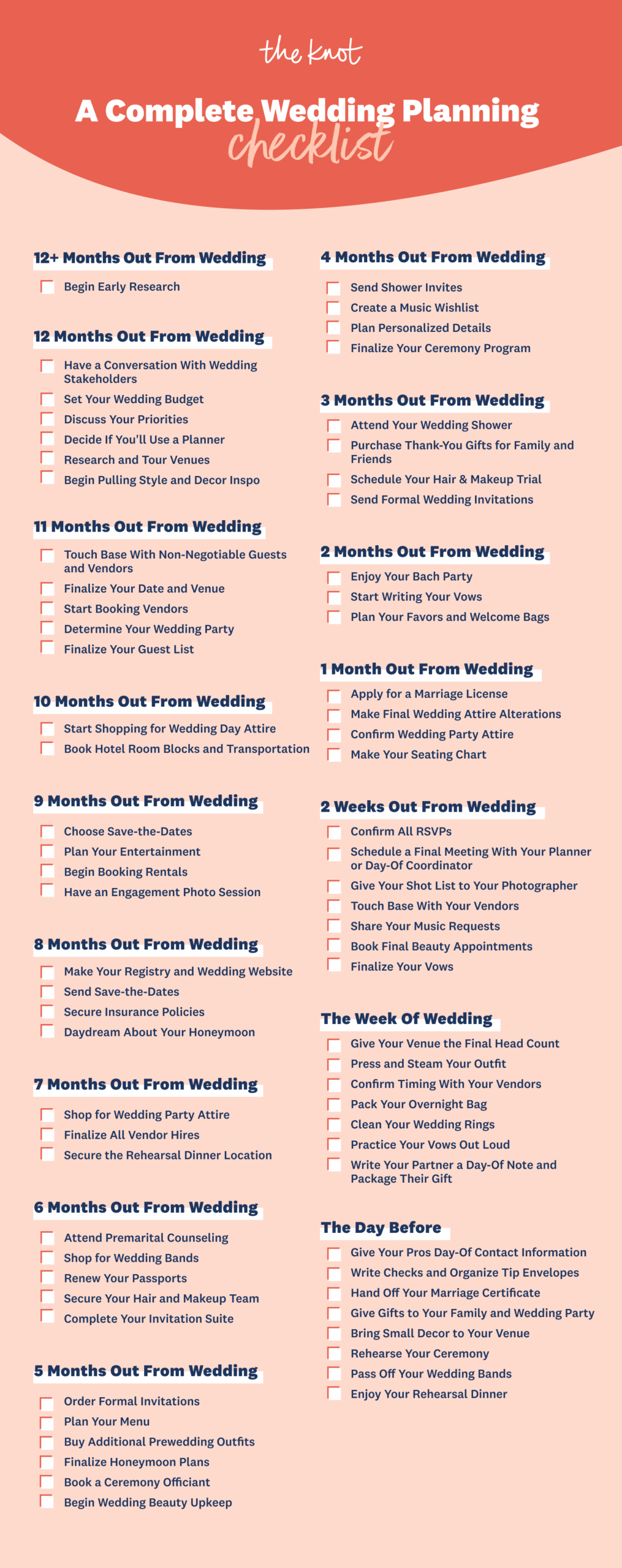 Whether you’re a meticulous planner or someone who tends to procrastinate, having a printable wedding checklist from The Knot can make the wedding planning process smoother and less stressful. It serves as a roadmap to guide you through each step, ensuring that you’re well-prepared for your big day.