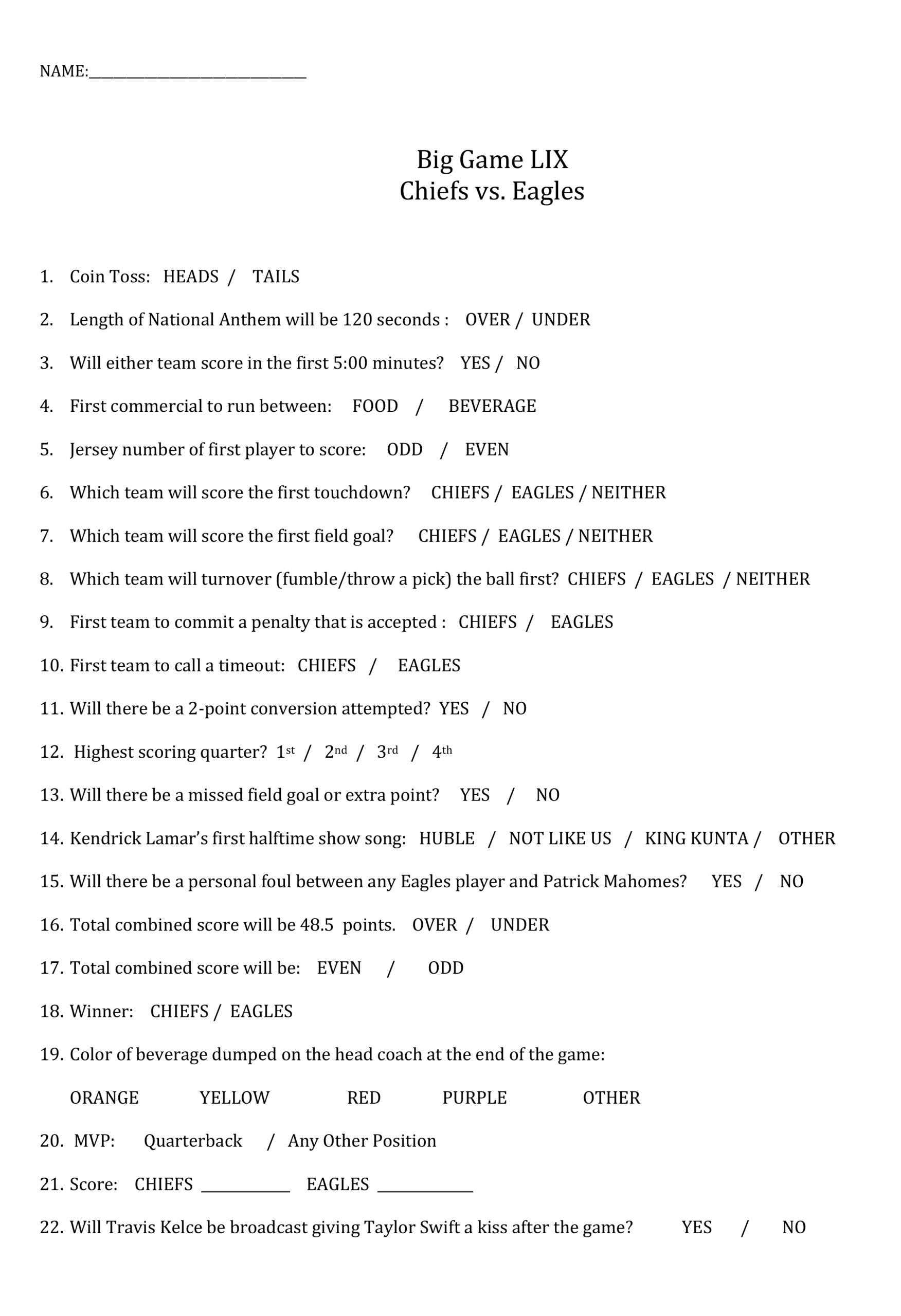 Free Super Bowl Prop Bet Sheet For 2025 Printable
