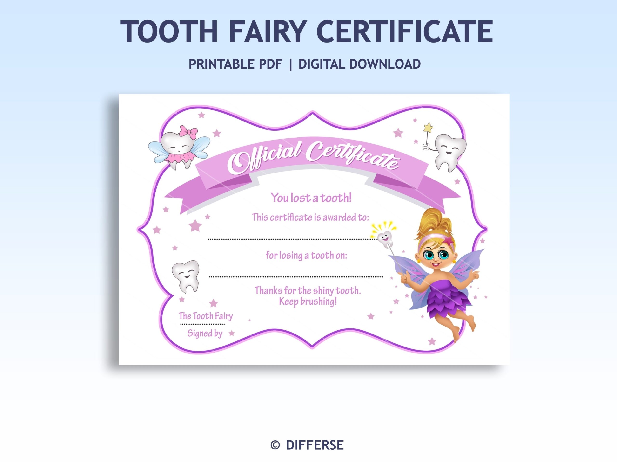 Whether it’s your child’s first lost tooth or their fifth, a Tooth Fairy Certificate Printable Girl is sure to bring a smile to their face. So why not add a little magic to this childhood milestone with a personalized certificate from the tooth fairy?